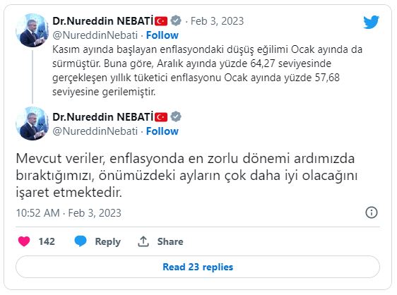 Nebati, Twitter hesabından yaptığı paylaşımda, Türkiye İstatistik Kurumunun açıkladığı ocak ayına ilişkin enflasyon verilerini değerlendirdi.
