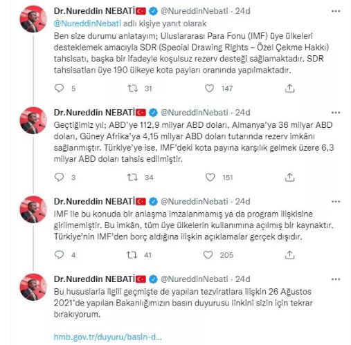 IMF ile bu konuda bir anlaşma imzalanmamış ya da program ilişkisine girilmemiştir. Bu imkân, tüm üye ülkelerin kullanımına açılmış bir kaynaktır. Türkiye’nin IMF’den borç aldığına ilişkin açıklamalar gerçek dışıdır.''