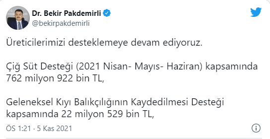 Çiğ Süt Desteği (2021 Nisan- Mayıs- Haziran) kapsamında 762 milyon 922 bin TL,