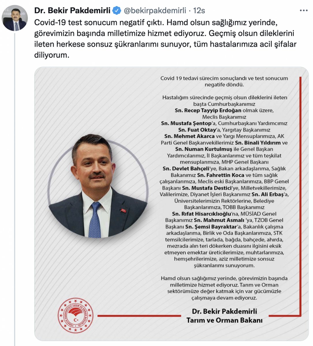 Paylaşımda, "Covid-19 test sonucum negatif çıktı. Hamd olsun sağlığımız yerinde, görevimizin başında milletimize hizmet ediyoruz. Geçmiş olsun dileklerini ileten herkese sonsuz şükranlarımı sunuyor, tüm hastalarımıza acil şifalar diliyorum." ifadeleri yer aldı.