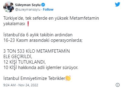 Bakan Soylu, "İstanbul'da 6 aylık takibin ardından 16-23 Kasım arasındaki operasyonlarda, 3 ton 533 kilo metamfetamin ele geçirildi, 12 kişi tutuklandı, 10 kişi hakkında adli işlemler sürüyor. İstanbul Emniyetimize tebrikler." ifadelerini kullandı.