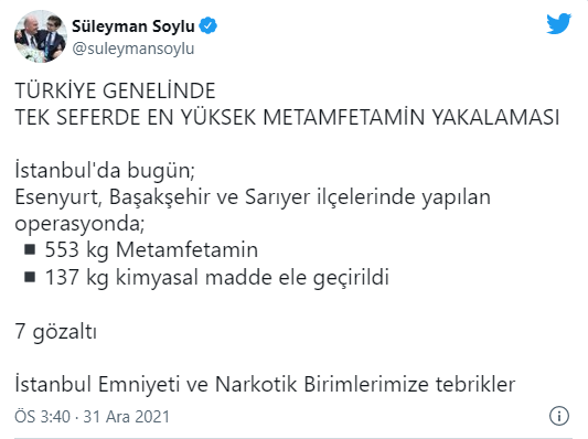 "Türkiye genelinde tek seferde en yüksek metamfetamin yakalaması. İstanbul'da bugün; Esenyurt, Başakşehir ve Sarıyer ilçelerinde yapılan operasyonda; 553 kg metamfetamin, 137 kg kimyasal madde ele geçirildi. 7 gözaltı. İstanbul Emniyeti ve Narkotik Birimlerimize tebrikler."