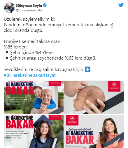 İçişleri Bakanı Süleyman Soylu, "Üzülerek söylemeliyim ki; Pandemi döneminde emniyet kemeri takma alışkanlığı ciddi oranda düştü." diyerek, "Emniyet Kemeri takma oranı %85'lerden; şehir içinde %45'lere, şehirler arası seyahatlerde %63'lere düştü. Sevdiklerimize sağ salim kavuşmak için #BiHareketineBakarHayat" paylaşımında bulundu.