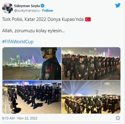 İçişleri Bakanı Süleyman Soylu, sosyal medya hesabından, Dünya Kupası için Katar'da bulunan Türk Polis Görev Gücü'nden fotoğraflar paylaştı. Bakan Soylu, mesajında "Türk polisi, Katar 2022 Dünya Kupası'nda. Allah, zorumuzu kolay eylesin." ifadelerini kullandı.
