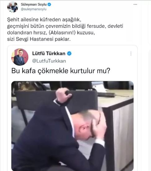 Sosyal medya hesabından açıklama yapan Bakan Soylu, ''Şehit ailesine küfreden aşağılık,geçmişini bütün çevremizin bildiği fersude, devleti dolandıran hırsız, (Ablasının!) kuzusu, sizi Sevgi Hastanesi paklar.'' ifadelerini kullandı.