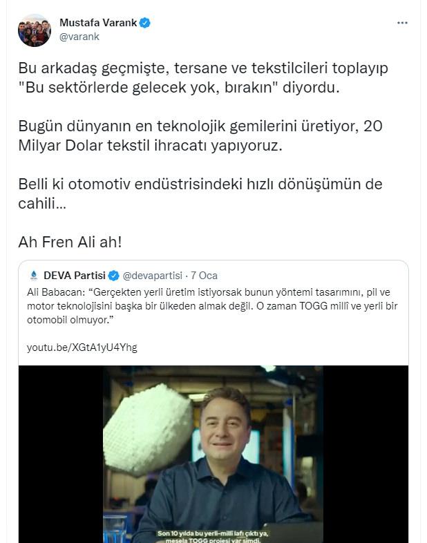 Sosyal medya hesabından paylaşımda bulunan Varank, "Bu arkadaş geçmişte, tersane ve tekstilcileri toplayıp 'Bu sektörlerde gelecek yok, bırakın' diyordu. Bugün dünyanın en teknolojik gemilerini üretiyor, 20 milyar dolar tekstil ihracatı yapıyoruz. Belli ki otomotiv endüstrisindeki hızlı dönüşümün de cahili… Ah Fren Ali ah!" ifadelerine yer verdi.