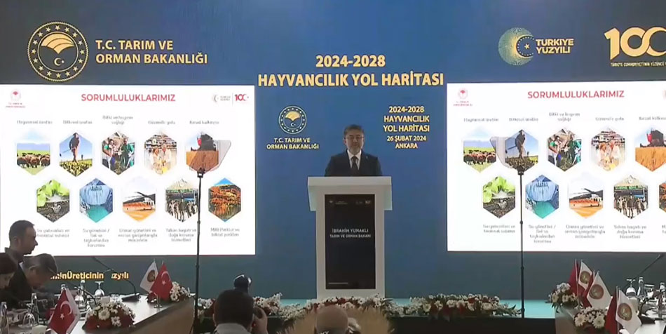 Bakan Yumaklı, hayvancılık yol haritasını açıkladıTarım ve Orman Bakanı İbrahim Yumaklı, hayvancılık yol haritasının açıklandığı toplantıda konuştu.26 Şubat 2024, Pazartesi - 10:00 Tarım ve Orman Bakanı Yumaklı, Ankara'da "2024-2028 Hayvancılık Yol Haritası"nı ilişkin basın toplantısı düzenledi.Tarım ve Orman Bakanı İbrahim Yumaklı'nın açıklamalarından bazı satırbaşları:Almanya’da faaliyet gösteren Türk İş insanından küresel kriz uyarısı"Arı işletme sayısını 1136'dan 1 bine çıkacağız"Etiketler: İbrahim Yumaklı 2024-2028 Hayvancılık Yol Haritası