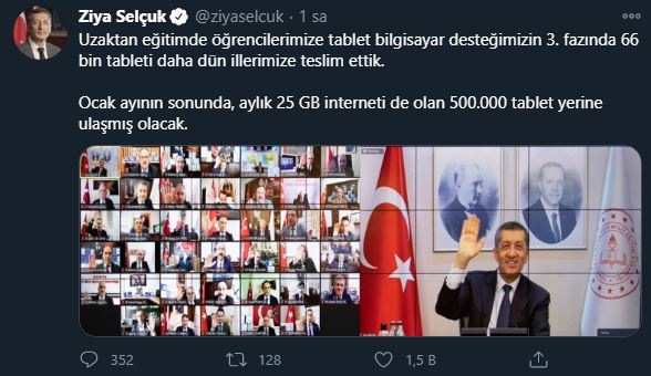 Bakan Selçuk, Twitter'daki açıklamasında; aylık 25 GB internetin yanı sıra 500 bin tabletin de öğrencilere temin edilmiş olacağı müjdesini verdi.
