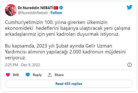 Nebati, "Bu kapsamda, 2023 yılı Şubat ayında gelir uzman yardımcısı alımının yapılacağı 2 bin kadronun müjdesini veriyoruz." değerlendirmesinde bulundu.