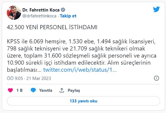Sağlık Bakanı Koca personel alımıyla ilgili sosyal medya hesabından şu açıklama yaptı.