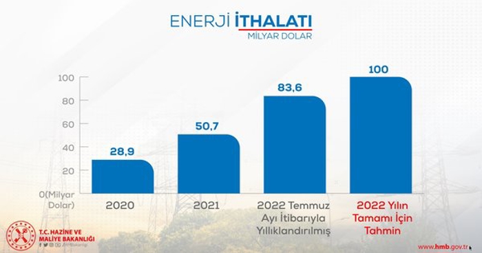 2020 yılında 28,9 milyar dolar olan enerji faturamız 2021 yılında 50,7 milyar dolara yükselmiştir. Ulaştığımız ekonomik büyüklüğün ve rekor seviyede artan küresel enerji fiyatlarının sonucu olarak bu faturanın 2022 sonunda 100 milyar dolar seviyelerine yükselmesi öngörülmektedir.