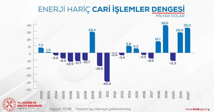 Cari denge konusuna dönecek olursak, içinde bulunduğumuz 2022 yılı Ocak-Haziran döneminde enerji hariç değerlendirildiğinde cari işlemler dengesinde 8,1 milyar dolar; yıllık bazdaki cari işlemler dengesindeyse 35 milyar dolar fazla vermeyi başardık.