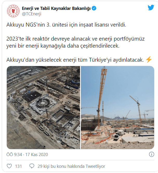 Enerji ve Tabii Kaynaklar Bakanlığı, resmi Twitter hesabından yaptığı açıklamada Akkuyu Nükleer Güç Santrali'nin (NGS) 3. ünitesine inşaat lisansı verildiğini kamuoyuna duyurdu. Bakanlık açıklamasında ilk reaktörün 2023 yılında devreye alınacağını belirtti.