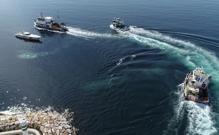 Güzelbahçe Balıkçı Barınağı'ndaki 36 tekne, hazırlıklarının ardından siren çalarak mavi sulara açılmak üzere halat çözdü.