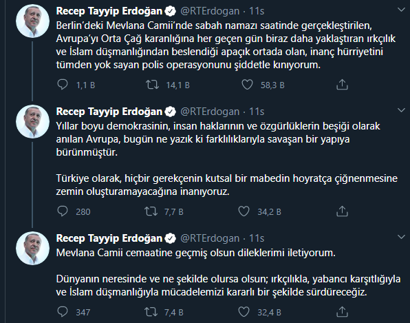 Cumhurbaşkanı Recep Tayyip Erdoğan, Almanya'nın başkenti Berlin'de bulunan Mevlana Camii'ne gerçekleştirilen polis operasyonunu Twitter hesabı üzerinden yaptığı paylaşımlarla kınadı. Sabah namazı saatlerinde gerçekleşen bu operasyonun sebebinin İslam düşmanlığı olduğunu savunan Başkan Erdoğan, Avrupa ülkelerinin bu tarz ırkçı eylemler sebebiyle her gün biraz daha fazla Orta Çağ'ın karanlığına gömüldüğünü vurguladı.