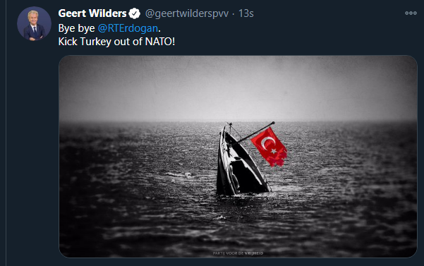 İslam düşmanlığıyla tanınan Hollanda Özgürlük Partisi Genel Başkanı Geert Wilders, Twitter'dan yaptığı paylaşımla Türkiye'yi hedef aldı. Küstah bir paylaşım yapan Wilders, üzerinde Türk bayrağı yer alan bir teknenin fotoğrafını paylaştı. Fotoğrafta teknenin battığı görüldü.