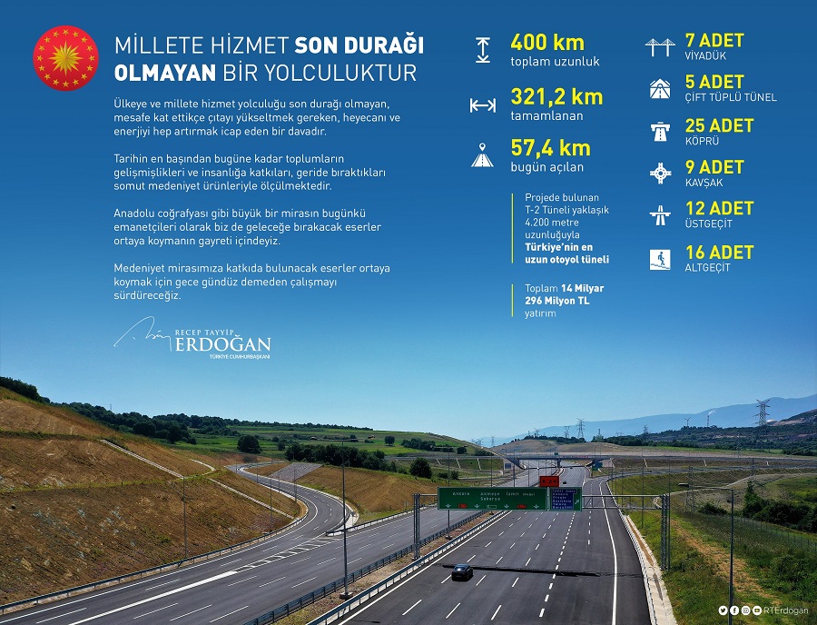 Cumhurbaşkanının Twitter'da paylaştığı görselde, otoyola ait bilgilendirme mesajları yer aldı. Görsele göre otoyolun toplam uzunluğu 400 kilometre, tamamlanan uzunluğu ise 321,2 kilometre olarak belirtildi. Bugün açılan kesimin ise 57,4 kilometre olduğu vurgulandı.