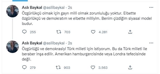 Sosyal medya hesabından paylaşımda bulunan Aslı Baykal, "Özgürlüğü ve demokrasiyi Türk milleti için istiyorum. Bu da Türk milleti ile beraber inşa edilir. Amerikan hamburgercisinde veya Londra tefecisinde değil." dedi.