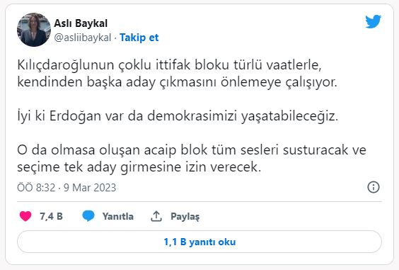 "Kılıçdaroğlunun çoklu ittifak bloku türlü vaatlerle, kendinden başka aday çıkmasını önlemeye çalışıyor. İyi ki Erdoğan var da demokrasimizi yaşatabileceğiz. O da olmasa oluşan acaip blok tüm sesleri susturacak ve seçime tek aday girmesine izin verecek."
