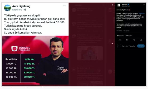 Baykar Yönetim Kurulu Başkanı Selçuk Bayraktar'ın fotoğrafları kullanılarak yayınlanan "yatırım fırsatı", "ek gelir" gibi başlıklı ilanlar açıkça dolandırıcılık girişimidir.