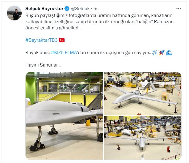 Paylaşımında, "Bugün paylaştığımız fotoğraflarda üretim hattında görünen, kanatlarını katlayabilme özelliğine sahip türünün ilk örneği olan 'balığın' ramazan öncesi çekilmiş görselleri. Büyük abisi Kızılelma'dan sonra ilk uçuşuna gün sayıyor" ifadelerini kullandı.