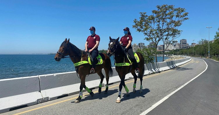Çevik Kuvvet Şube Müdürlüğü'ne bağlı atlı polisler, Ramazan Bayramı'nın birinci gününde Kadıköy Caddebostan Sahili'nde tam kapanma denetimi yaptı. Kıyı şeridinde devriye gezen ekipler, sahilde bulunanları durdurarak izin belgelerinin olup olmadığını kontrol etti. Denetimlerde polis köpekleri de yer aldı.