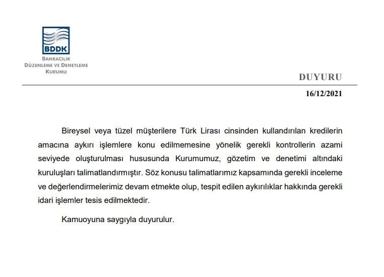 BDDK'nın yaptığı açıklamada, "Bireysel veya tüzel müşterilere Türk Lirası cinsinden kullandırılan kredilerin amacına aykırı işlemlere konu edilmemesine yönelik gerekli kontrollerin azami seviyede oluşturulması hususunda Kurumumuz, gözetim ve denetimi altındaki kuruluşları talimatlandırmıştır. Söz konusu talimatlarımız kapsamında gerekli inceleme ve değerlendirmelerimiz devam etmekte olup, tespit edilen aykırılıklar hakkında gerekli idari işlemler tesis edilmektedir. Kamuoyuna saygıyla duyurulur." ifadeleri yer aldı.