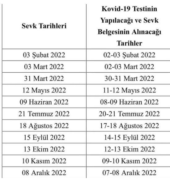 Kovid-19 Testinin Yapılacağı ve Sevk Belgesinin Alınacağı Tarihler - 02-03 Şubat 2022