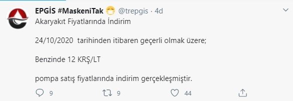 @trepgis tarafından yapılan paylaşımda, 24.10.2020 tarihinden itibaren geçerli olacak şekilde benzinin litre fiyatında 12 kuruşluk indirim yapıldığı belirtildi. EPGİS'in paylaşımı şu şekilde;