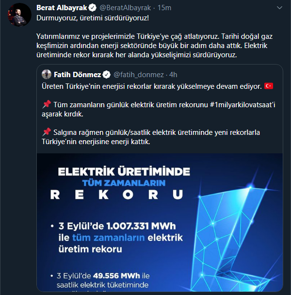 "Durmuyoruz, üretimi sürdürüyoruz! Yatırımlarımız ve projelerimizle Türkiye’ye çağ atlatıyoruz. Tarihi doğal gaz keşfimizin ardından enerji sektöründe büyük bir adım daha attık. Elektrik üretiminde rekor kırarak her alanda yükselişimizi sürdürüyoruz."