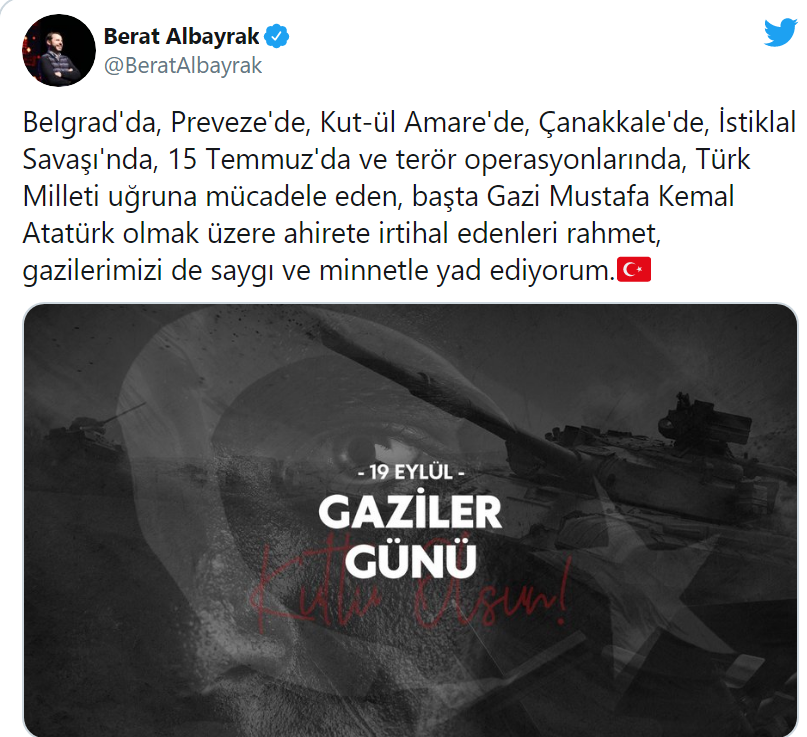 Hazine ve Maliye Bakanı Berat Albayrak, sosyal medya platformu Twitter üzerindeki resmi hesabından yayınladığı mesajla 'Gaziler Günü'nü kutladı.