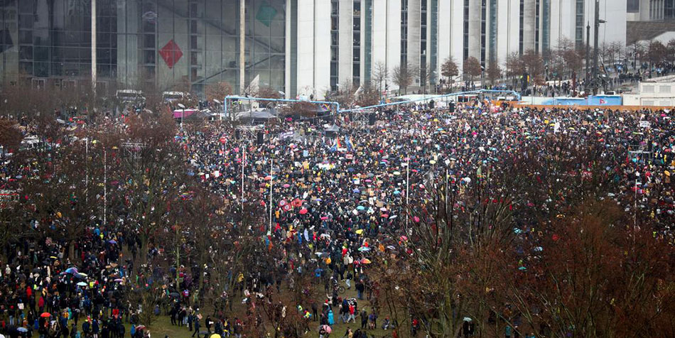 Polisin verdiği bilgilere göre Berlin'de El Ele İttifakının Federal Meclis binası önünde düzenlenen gösteriye yağmurlu havaya rağmen katılım 150 bin kişiyi geçti. Demokrasi ve hoşgörü için, aşırı sağa, nefrete ve Almanya için Alternatif (AfD) partisine karşı düzenlenen gösteriye organizatörler ise 300 bin kişinin katıldığını duyurdu. Gösteride insan zinciri oluşturulması planlanıyordu ancak katılımın yüksek olması nedeniyle zincir yerine binlerce gösterici bir yanındakinin elini tutarak göğe kaldırdı.