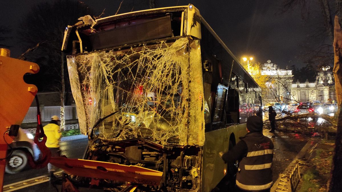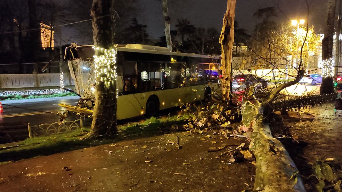 İstanbul'un Beşiktaş ilçesi Dolmabahçe Caddesi Saltanat Kapısı önünde yaşanan kazada, yağışlı hava nedeniyle aracının direksiyon hakimiyetini kaybeden İETT otobüs şoförü, kaldırımdaki ağaca çarptı.