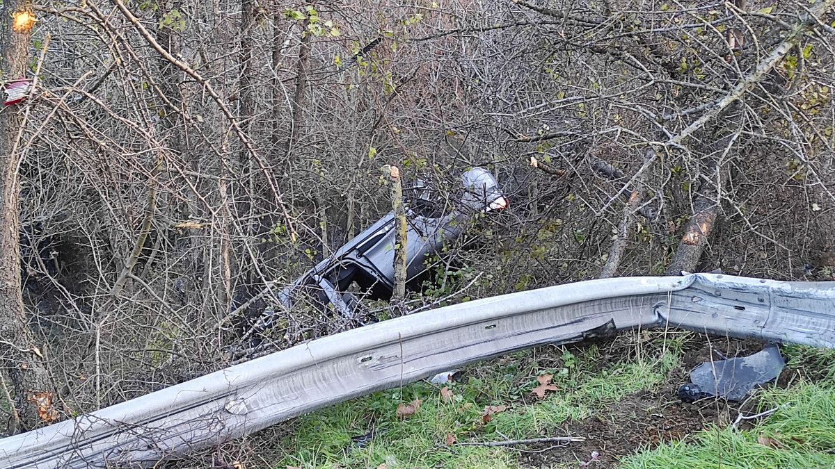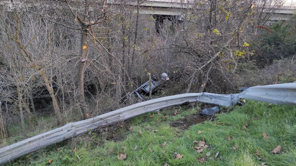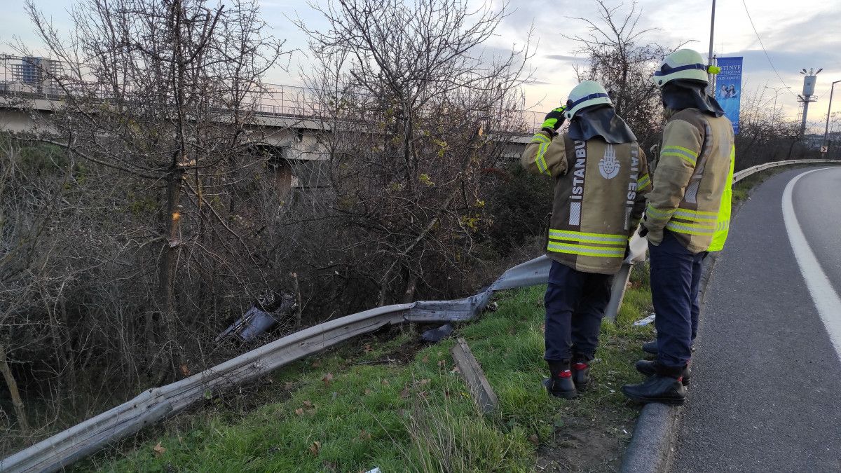 Kontrolden çıkan otomobil, bariyerleri parçalayarak şarampole uçtu. Yaklaşık 10 metre boyunca taklalar atarak yuvarlanan otomobil, ağaç dallarına çarparak durabildi.