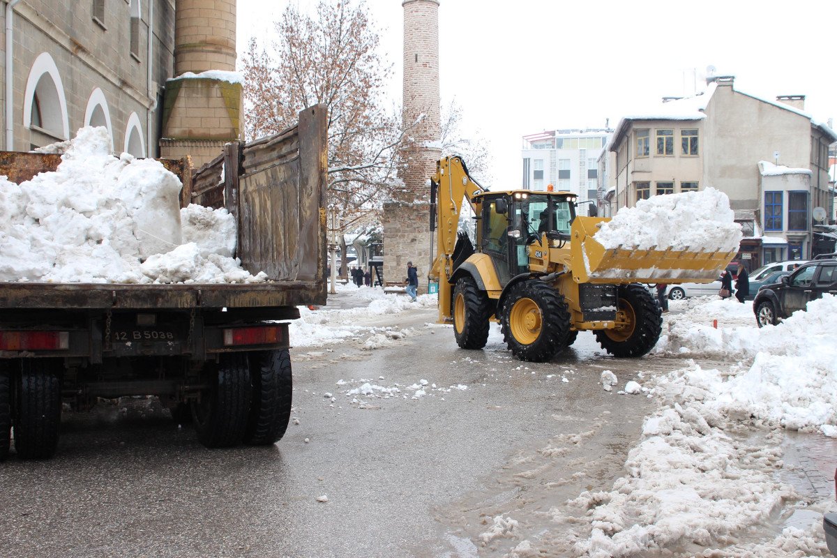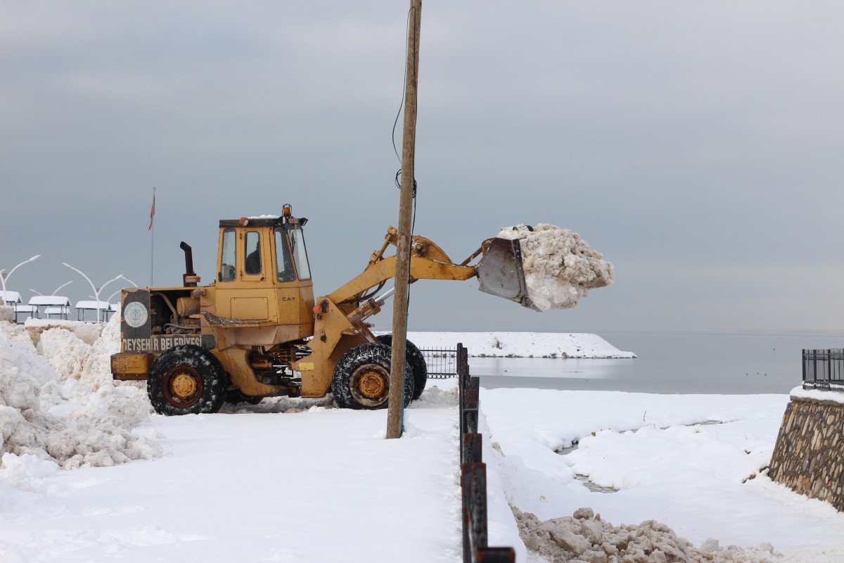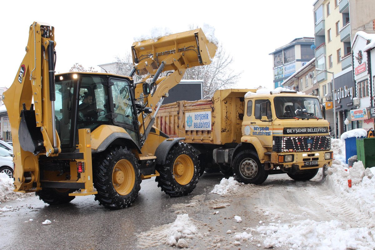 Konya’nın Beyşehir ilçesinde geçen hafta sonu etkili olan yağışla birlikte ilçe merkezinde kar kalınlığı 40, yüksek kesimlerde ise 70 santime ulaştı. Belediye ekipleri ilçe merkezinde temizlik çalışması yaparak, karlara iş makineleri ile topladı.