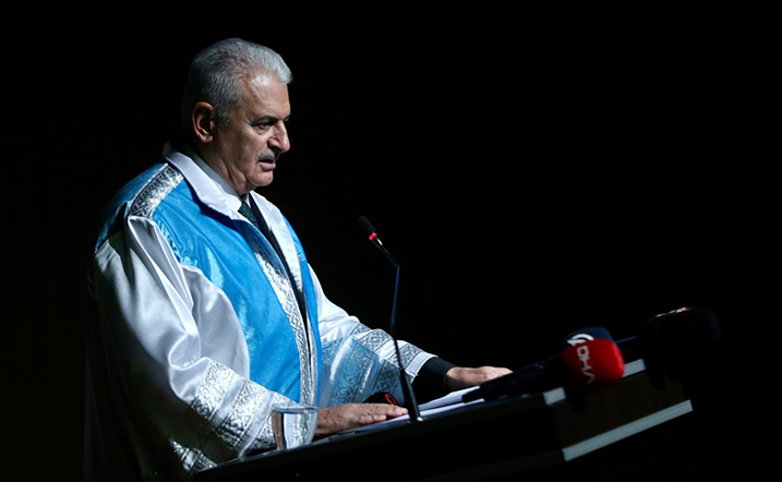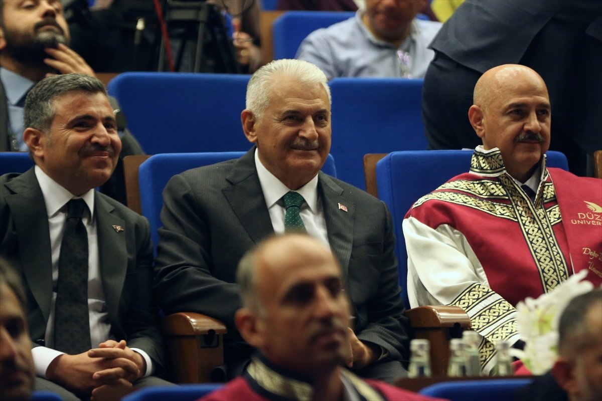 İstiklal Marşının okunması ve saygı duruşunda bulunulmasının ardından Düzce Üniversitesi senatosu tarafından Binali Yıldırım’a mühendislik alanında fahri doktora belgesi Rektör Prof. Dr. Nedim Sözbir tarafından verildi.
