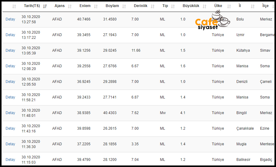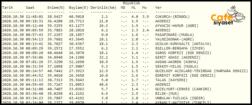 AFAD tarafından yapılan son deprem ölçümleri şu şekilde: