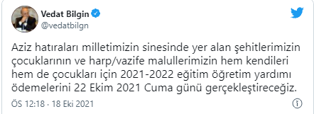 Çalışma ve Sosyal Güvenlik Bakanı Vedat Bilgin, Twitter'dan eğitim ve öğretim yardımlarıyla ilgili açıklamada bulundu. Bakan Bilgin, "Aziz hatıraları milletimizin sinesinde yer alan şehitlerimizin çocuklarının ve harp/vazife malullerimizin hem kendileri hem de çocukları için 2021-2022 eğitim öğretim yardımı ödemelerini 22 Ekim 2021 Cuma günü gerçekleştireceğiz" dedi.