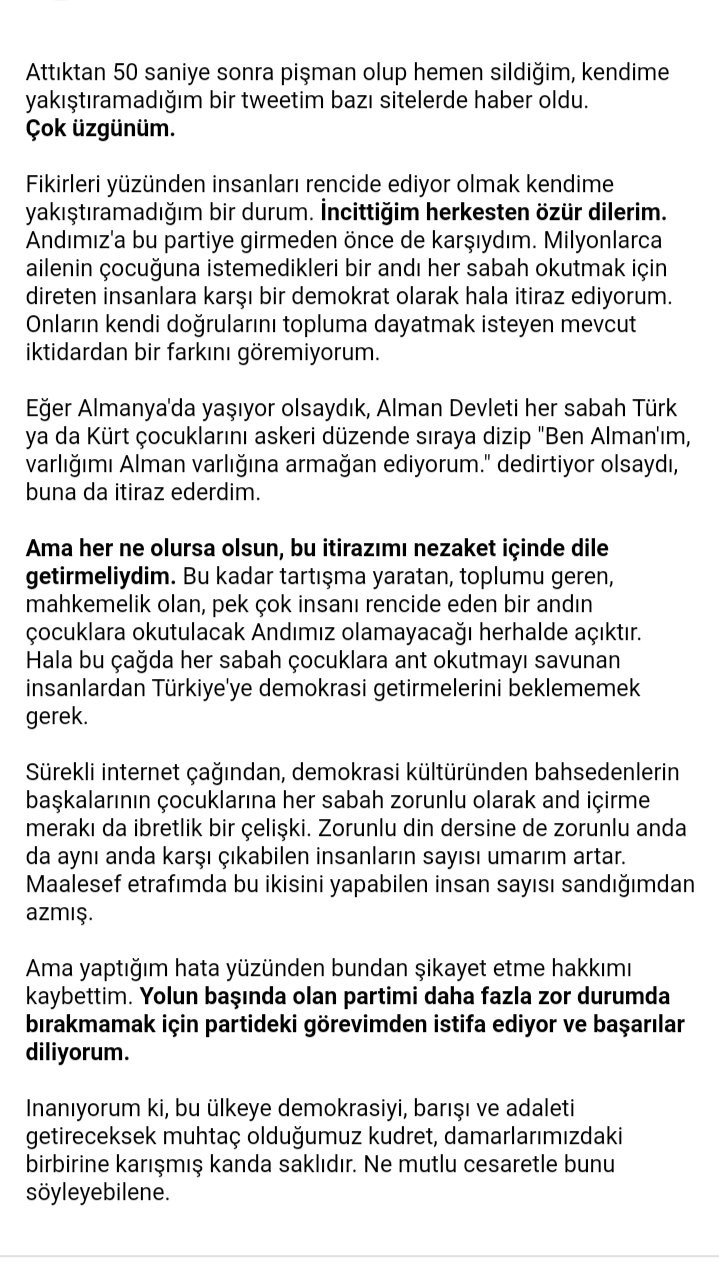 DEVA Partisi İstanbul Yöneticisi Beytullah Aksoy sosyal medya hesabından "Öğrenci Andı" ile ilgili sözleri nedeniyle özür dileyerek partisinden istifa ettiğini duyurdu.