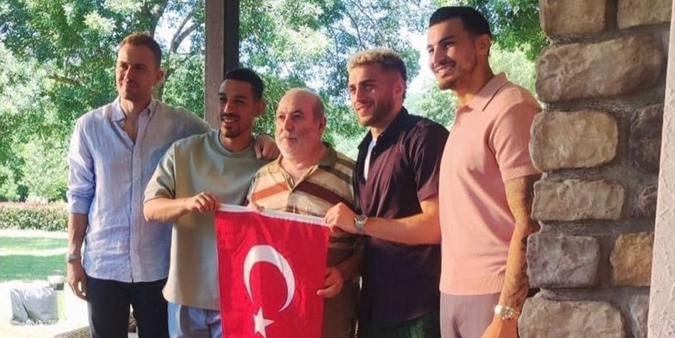 A Milli Takımı futbolcuları Mert Günok, İrfan Can Kahveci, Barış Alper Yılmaz ve Uğurcan Çakır, bayrak asan adamla bir araya geldi.