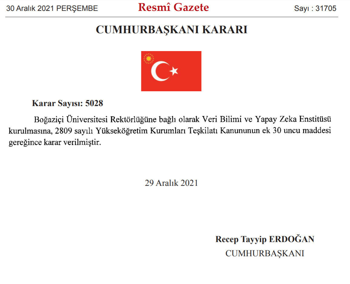 Cumhurbaşkanı kararı ile Boğaziçi Üniversitesi Rektörlüğüne bağlı olarak Veri Bilimi ve Yapay Zeka Enstitüsü kurulmasına karar verildi.