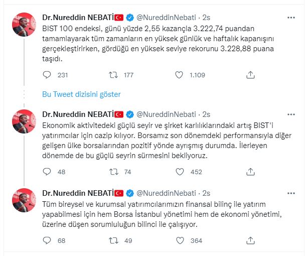 Hazine ve Maliye Bakanı Nureddin Nebati, BIST 100 endeksinin, günü yüzde 2,55 kazançla 3.222,74 puandan tamamlayarak, tüm zamanların en yüksek günlük ve haftalık kapanışını gerçekleştirirken, gördüğü en yüksek seviye rekorunu 3.228,88 puana taşıdığını bildirerek, "Ekonomik aktivitedeki güçlü seyir ve şirket karlılıklarındaki artış BIST'i yatırımcılar için cazip kılıyor." ifadesini kullandı.