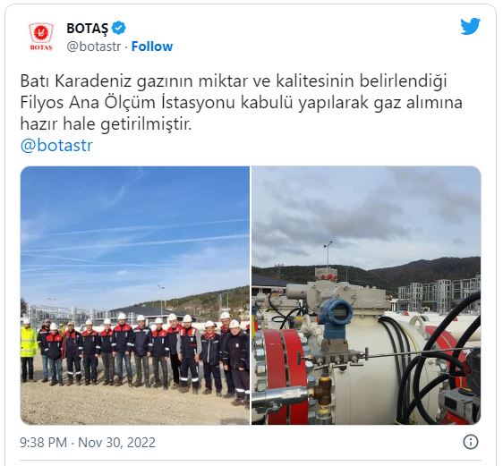 BOTAŞ'ın Twitter hesabından yapılan paylaşımda, "Batı Karadeniz gazının miktar ve kalitesinin belirlendiği Filyos Ana Ölçüm İstasyonu kabulü yapılarak gaz alımına hazır hale getirilmiştir." ifadesi kullanıldı.
