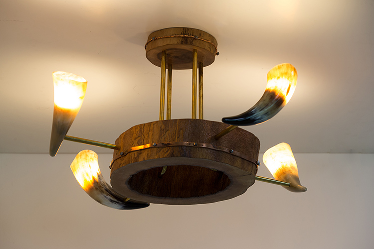 Tavşanlı ilçesinde entegre et işleme tesisi sahibi Abdurrahman Şirin, çeşitli yöntemlerle işlediği boynuzları aplik ve avizeye dönüştürüyor.