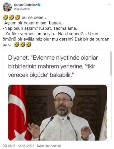 Şahan Gökbakar, Diyanet'in dijital kitaplarında yazan "Evlenme niyetinde olanların birbirlerinin mahrem yerlerine, ‘fikir verecek ölçüde’ bakabileceği belirtildi" ifadesini çarpıtarak sosyal medya kullanıcılarını galeyana getirdi.