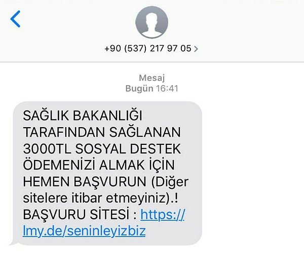 Sancılı pandemik süreçte dolandırıcılar yeni yöntemlerle vatandaşları zarara uğratıyor. Özellikle de devletin pandemi döneminde sunduğu sosyal yardım kampanyasını kamufle aracı olarak kullanmaya çalışan dolandırıcılar, son dönemlerde SMS yolu ile vatandaşlara ulaşıyor. Gönderilen SMS mesajında, "Sağlık Bakanlığı tarafından sağlanan 3 bin lira sosyal destek ödemenizi almak için hemen tıklayınız, diğer sitelere itibar etmeyiniz." gibi bir ibare yer alıyor.