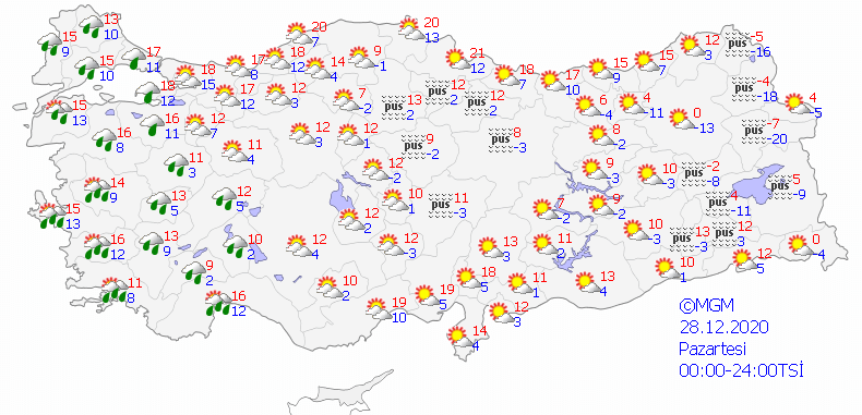 Yağışların; Antalya ve Kıyı Ege çevreleri ile Çanakkale ilinin güney kısımları, Balıkesir'in batı kıyı ilçelerinde kuvvetli yağış şeklinde (21-50 kg/m2), Muğla ilinin kıyı kesimleri ve Antalya'nın batı ilçelerinde ise yerel olarak çok kuvvetli yağış (51-75 kg/m2) olacağı bekleniyor. Sabah ve gece saatlerinden itibaren doğu ve iç kesimlerde sis ve yer yer pus olmasının yanı sıra don ve buzlanma olayları da bekleniyor.