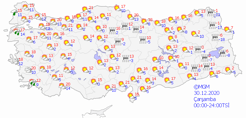 Meteoroloji Genel Müdürlüğü (MGM) tarafından yayımlanan haritalı hava durumu raporu şu şekilde;