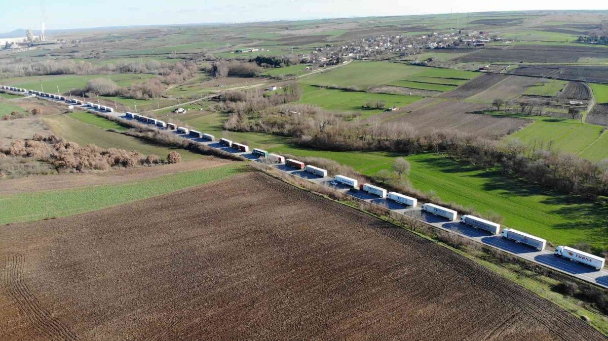 Yaklaşık bin 500 tır, Hamzabeyli Sınır Kapısı önünde yurt dışına çıkmak için işlemlerinin tamamlanmasını bekliyor.