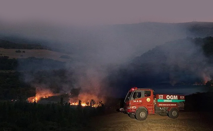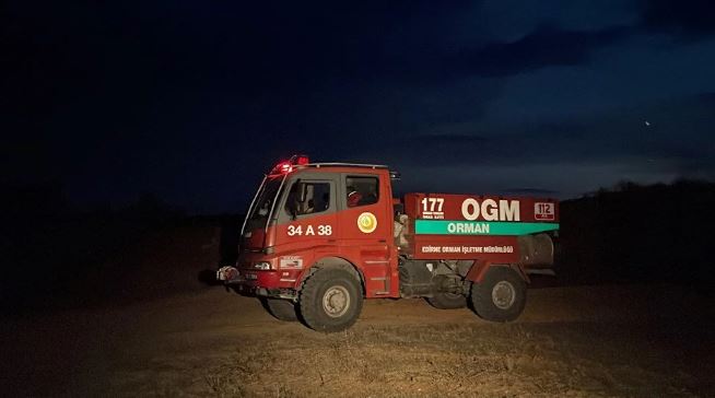 Edirne Orman İşletme Müdürlüğü'ne bağlı yangın söndürme aracı, tedbir amaçlı bekletiliyor. Yangının sürdüğü bölge ile Türkiye arasında Tunca Nehri bulunuyor.